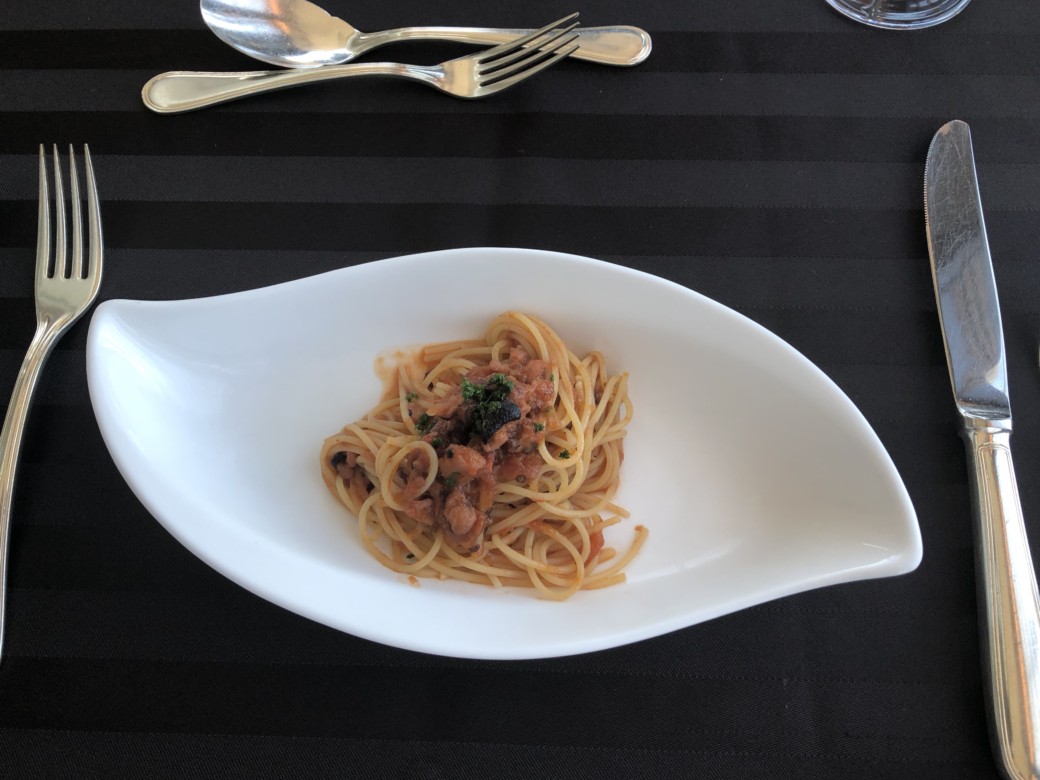 フランスパンやスープの後、パスタ![]()